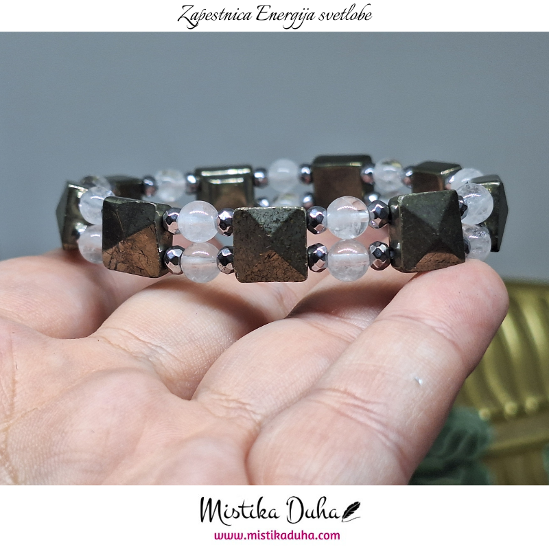 Povezuje se z notranjo močjo in sposobnostjo, da posameznik prevzame nadzor nad svojim življenjem, hkrati pa uravnoveša mentalne procese, spodbuja logično razmišljanje in analizo situacij. V duhovnih tradicijah ga cenijo kot kamen, ki ščiti pred negativnimi vplivi, energijsko stabilizira prostor in krepi občutek osebne varnosti. Pirit prav tako simbolizira obilje in materialno blaginjo, a njegova moč ni zgolj v pridobivanju, temveč v razumevanju lastne vrednosti in sposobnosti ustvarjanja priložnosti. Njegova prisotnost ustvarja občutek dinamike in osredotočenosti, hkrati pa subtilno uravnoveša notranje napetosti in stiske. Zaradi teh lastnosti je primeren tako za nošenje kot osebni energijski kamen, kot tudi za postavitev v prostor, kjer se želi spodbuditi produktivnost, zaščita in občutek stabilnosti. Pirit deluje kot kamen, ki združuje praktično moč z notranjo energijsko podporo, kar ga uvršča med kristale, ki spodbujajo rast, samozavest in jasno usmerjenost k ciljem.